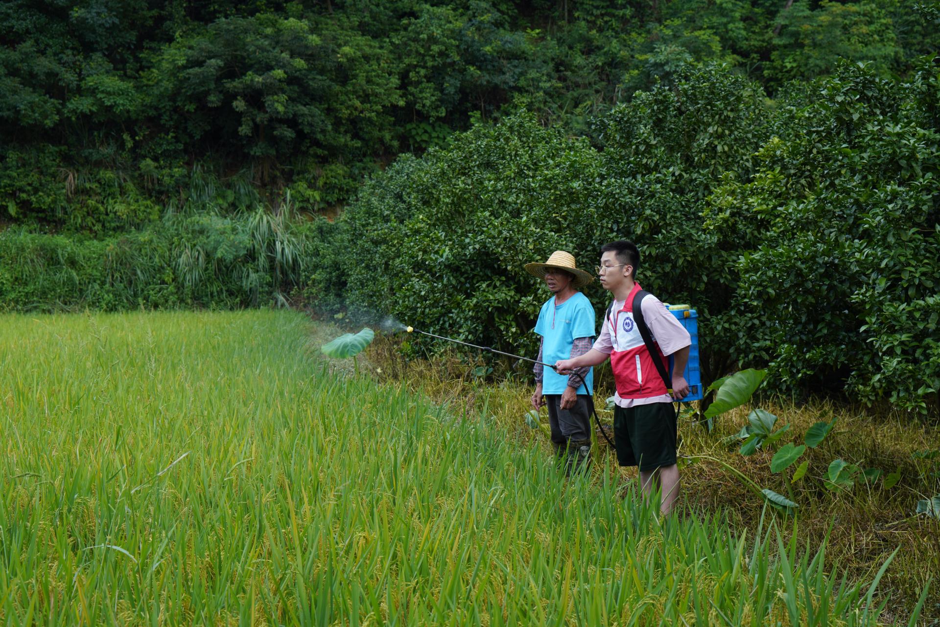 实践团成员帮助村民喷洒农药