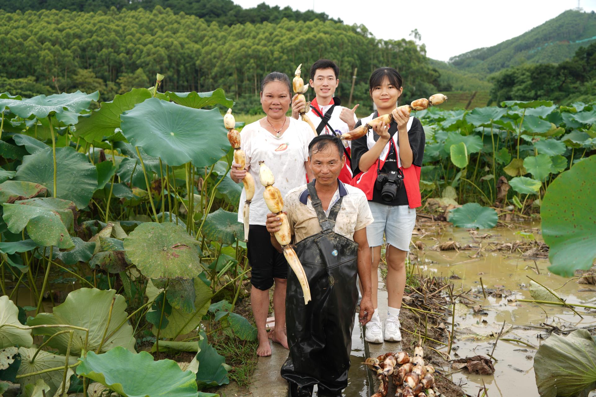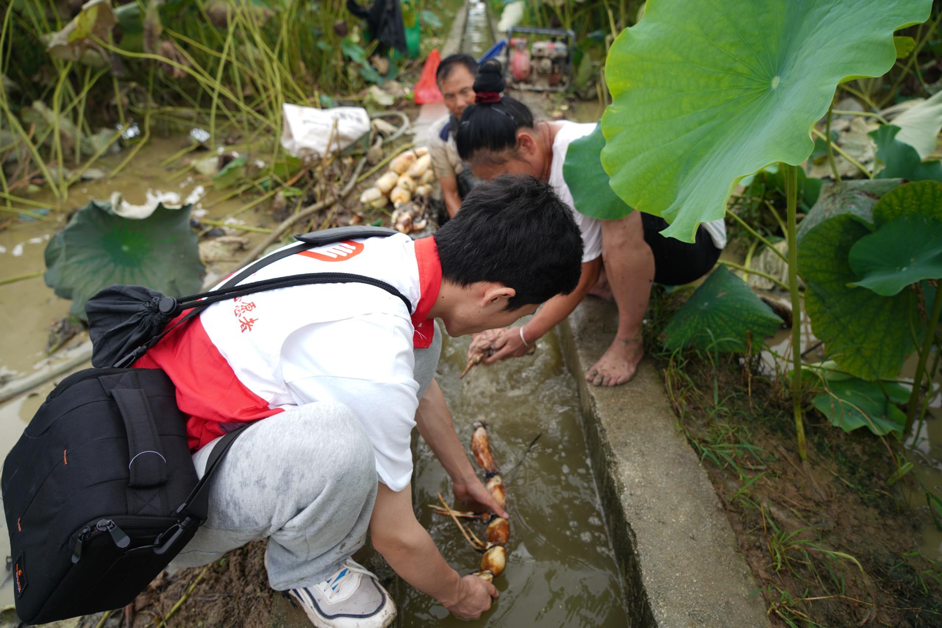 实践团成员帮助村民清洗莲藕