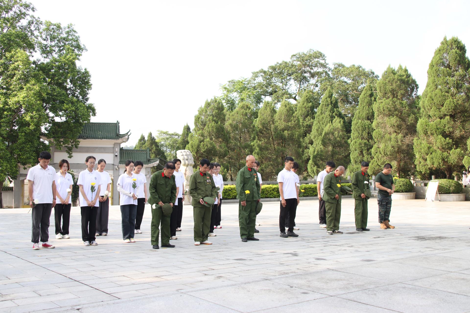 当日清晨,阳光明媚。实践团一行19人与6名老兵,在凭祥市退役军人事务局副局长彭武的带领下,怀着庄严肃穆的心情到达烈士陵园举行祭祀烈士活动仪式。园内庄严肃穆,被苍松翠柏环绕,象征着烈士们永垂不朽的精神。在烈士纪念碑前,大家肃立默哀,向为国家和人民英勇献身的烈士们献上鲜花并整理绶带,表达对英烈最崇高的敬意和最深切的缅怀。