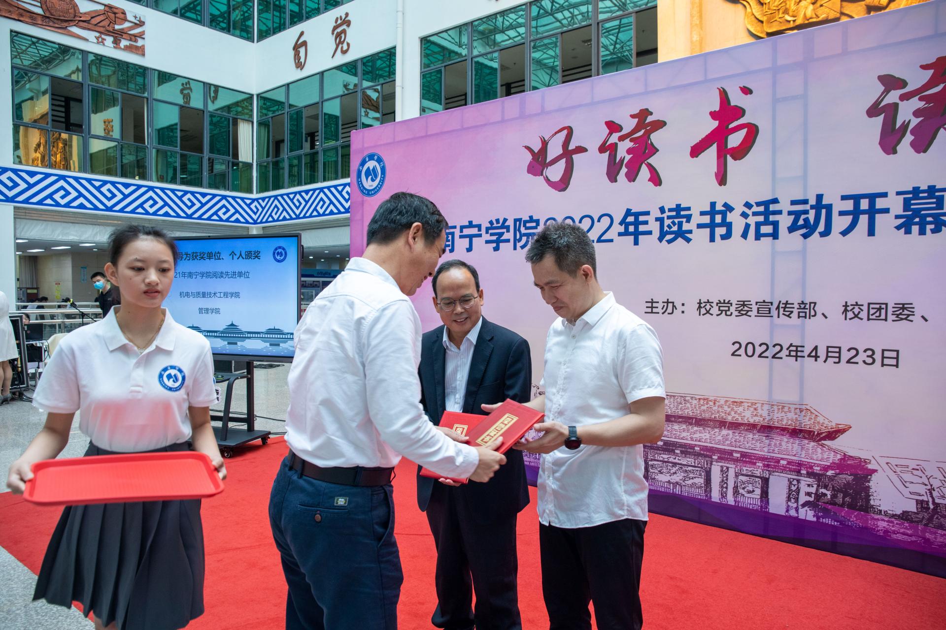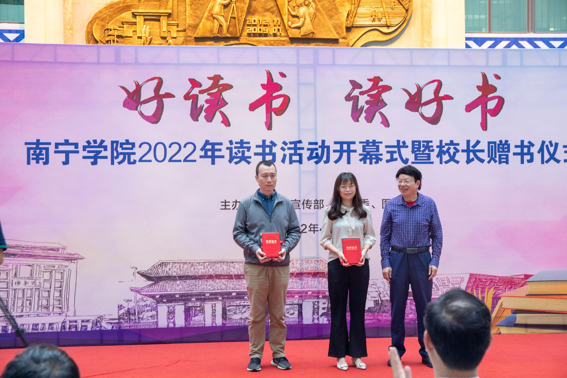 开幕式上,学校图书馆馆长谢清宣布获得“2021年kaiyun体育网页登录入口阅读先进单位”“2021年kaiyun体育网页登录入口积极荐书单位”“2021年kaiyun体育网页登录入口勤奋读者”名单。学校党委书记刘彪、校长李栋学,学校党委副书记、纪委书记覃存民,副校长李陶深、龚击分别为获奖单位、个人颁奖。