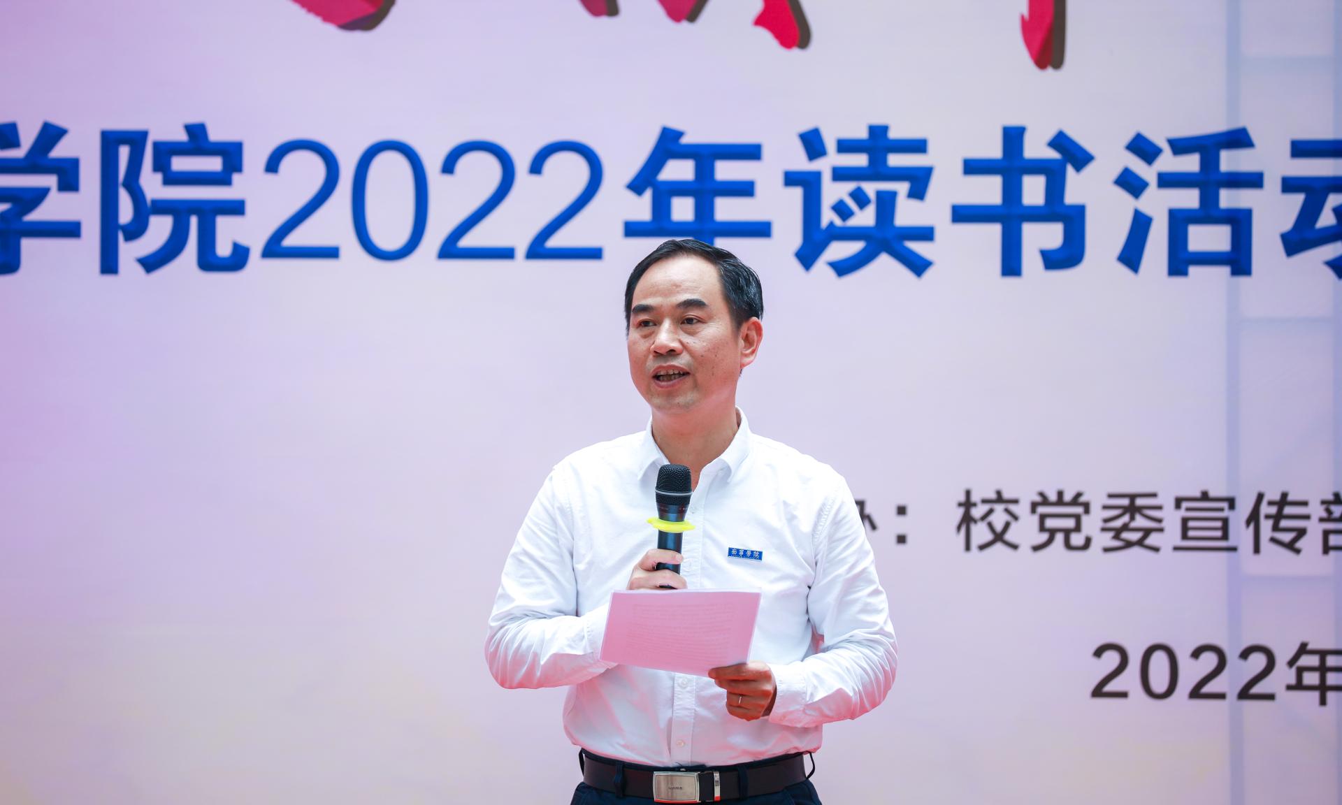 校长李栋学在读书活动开幕式上致辞。他指出,学校开展读书活动,主要目的是落实立德树人根本任务,扎实推进书香校园建设,夯实校园文化底蕴,聚焦学校发展、力促师成生长,不断提升广大师生的文化素质和精神风貌,在全校形成好读书、读好书的浓厚氛围,推动树立良好的教风学风,为学校特色发展、创新发展提供精神动力和文化支撑。“腹有诗书气自华,最是书香能致远”,李栋学校长用古往今来仁人志士的读书故事勉励师生。希望全体师生养成好读书的习惯,放下手机,沉下心来,专心阅读好书,把读书学习作为一种生活方式和生活习惯,坚持阅读与思考相统一,读书与运用相结合,学以致用、增强本领,更好地推动学校建设和发展。