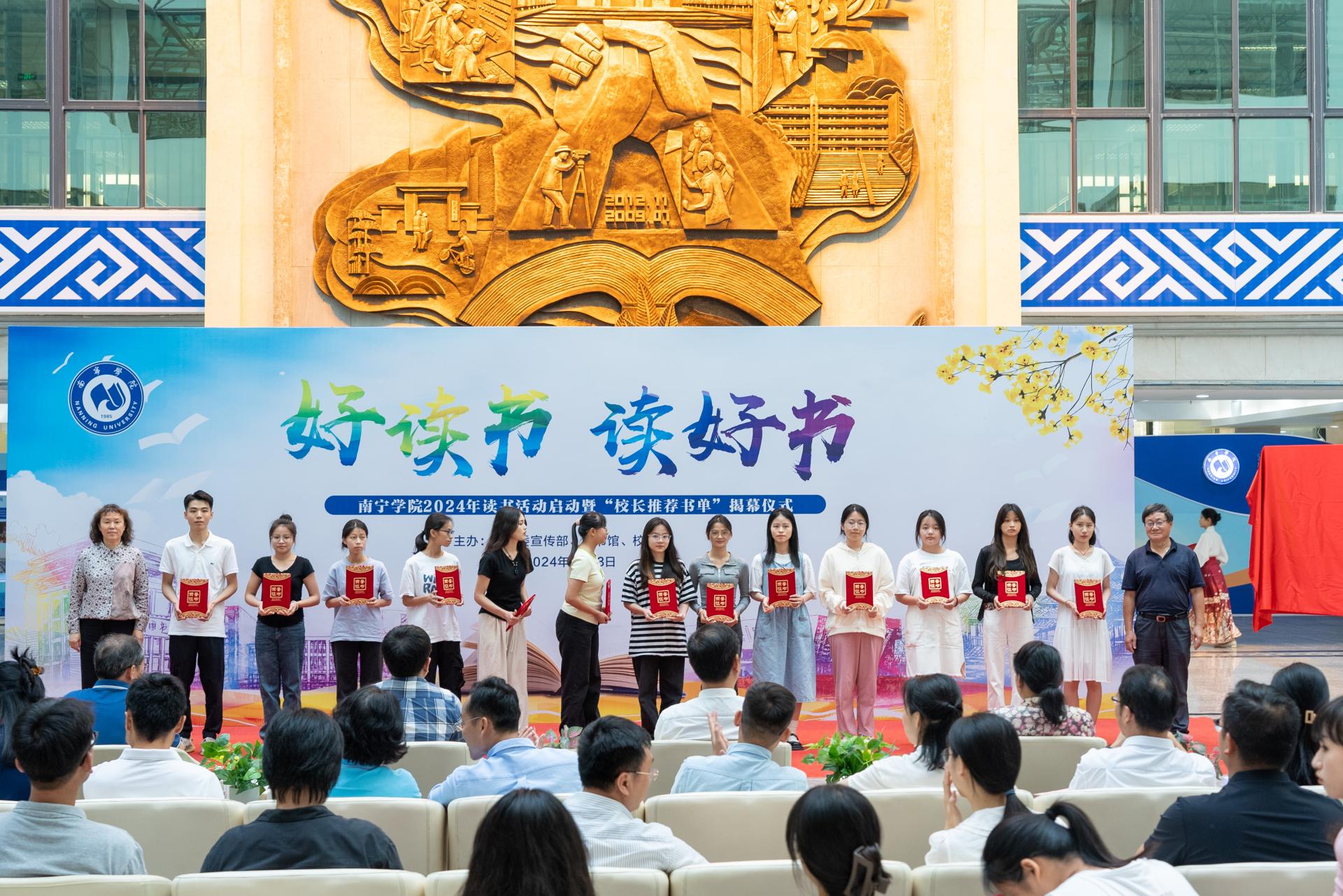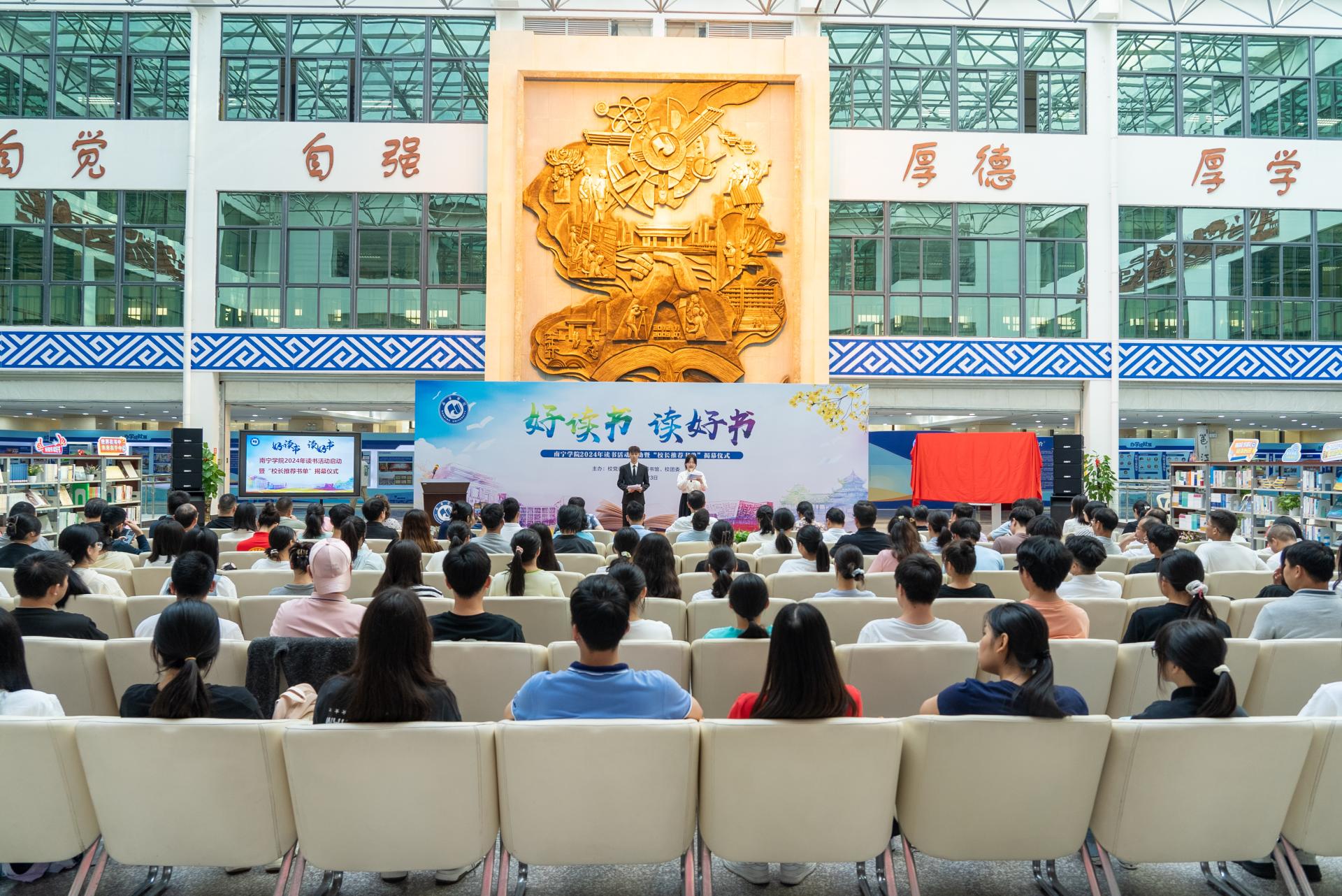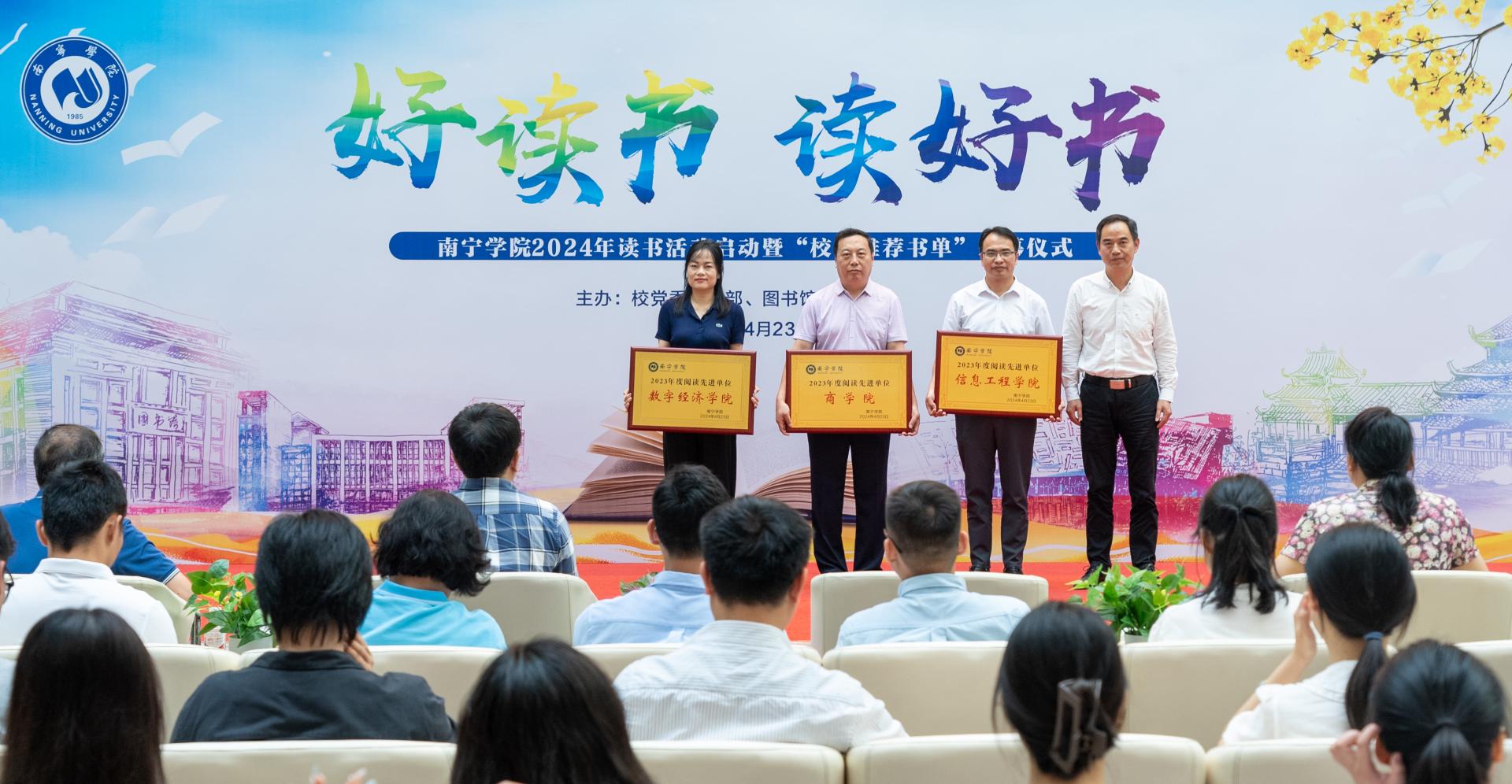 “2023年阅读先进单位”获得单位数字经济学院党总支副书记韦丹代表发言。她说,数字经济学院立足学院的学生生情和专业特色,积极推动阅读文化的发展,充分激发学生读书热情,2023年全院在校生图书借阅量共计29212册,出入图书馆共计43711人次。积极响应“读书沙龙系列活动”等,组织学院学生社团组织、基层班级、青年大学生开展各类读书分享会,5名学生获得2023年度勤奋读者。她希望,师生们能将读书变成一种伴随终身的良好习惯,可以依据自己的爱好、志向,选择自己所喜爱的书籍,选择经典名著来阅读。