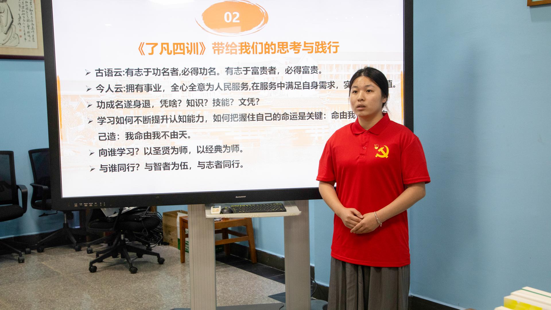 活动伊始,韦粤桂副书记首先引入了《了凡四训》中关于学习重要性的章节。她提到,书中讲述了犹太人因热爱学习而具有强大生命力和众多杰出人才的故事,这让我们深刻认识到学习对个人成长和发展的关键作用。韦副书记鼓励大家树立终身学习理念,不断学习新知识、技能和智慧,以丰富自己的内涵,提升竞争力,更好地应对生活中的各种挑战。