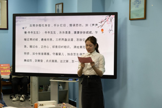 随后,图书馆党支部书记、副馆长韦相晓从词人简介与诗词鉴赏两个维度,带领大家深入走近婉约派词人李清照。韦副馆长以“为何李清照被称作‘千古第一才女’”这一问题引发同学们思考,进而引出词人的成长背景。李清照生活在北宋末年,历经繁华与动荡,其词作前期多描绘悠闲生活与爱情的美好,如《一剪梅·红藕香残玉簟秋》中委婉真挚的思念之情;后期则转为愁苦悲戚、深沉忧国,如《声声慢》中“寻寻觅觅,冷冷清清,凄凄惨惨戚戚”的孤独与凄凉。尽管历经坎坷,李清照依然精神富足,坚守自我,令人敬佩。韦副馆长号召同学们学习李清照“生当作人杰,死亦为鬼雄”的英雄气魄,敢于冲破层层精神枷锁的禁锢,勇于表达思想主张、追求平等、自由、幸福的勇气,展现女性自尊、自信、自立、自强的巾帼风采,以自强不息的奋斗姿态铸就“巾帼之志”,在无比广阔的新时代天地绘就壮美画卷。
