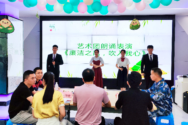 院艺术团表演的诗歌朗诵《廉洁之风,吹入我心》,声情并茂地诠释对于端午节新的理解,向师生发出深情号召:“满腔热情挥洒三尺讲台,以圣洁之心教圣洁之书;自觉自强树学习之风范,厚德厚学书写踏实人生。”