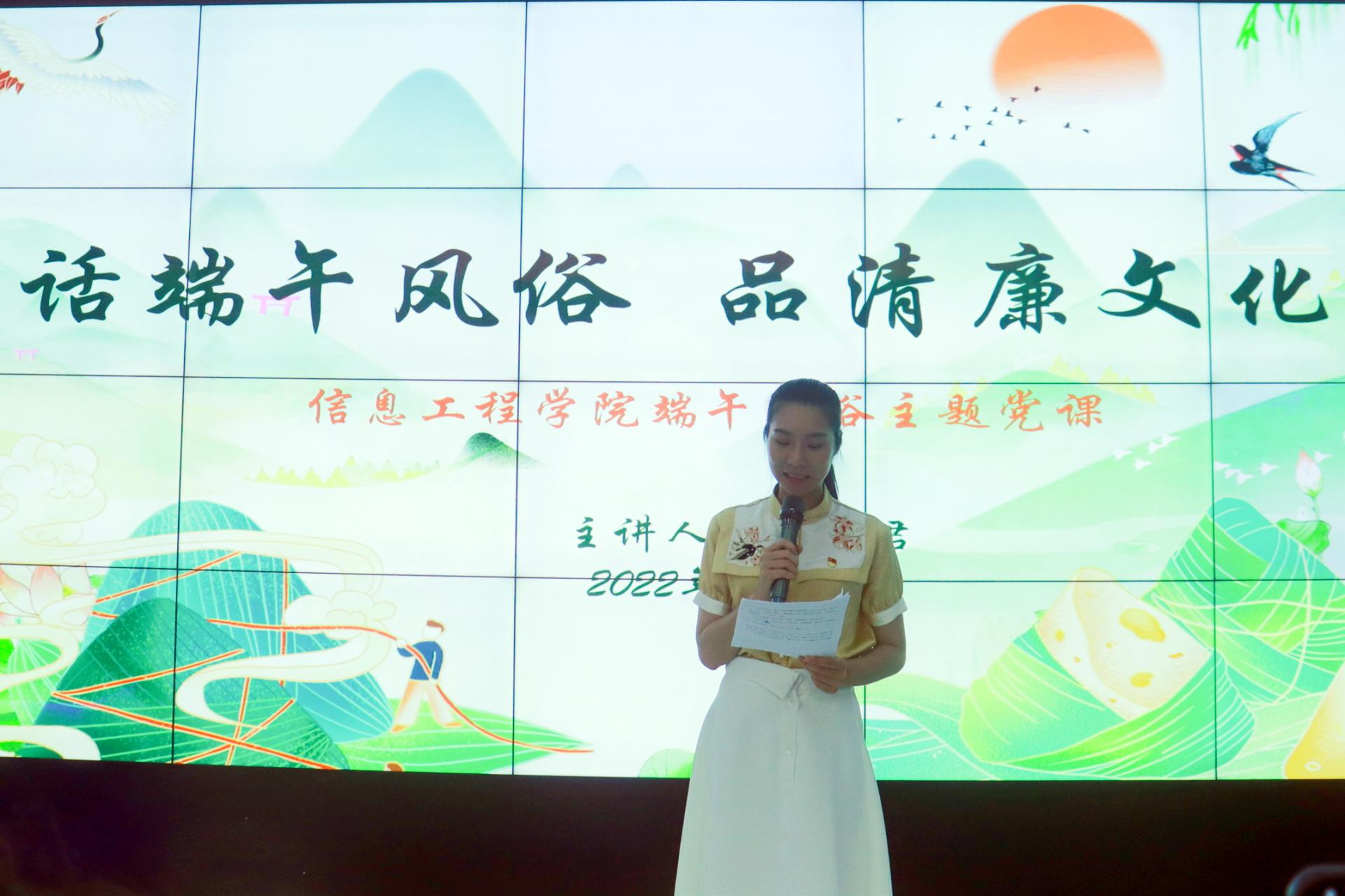 信息工程学院党委副书记、副院长岑铭君以《话端午风俗 品清廉文化》为主题给在场师生上了一堂生动的端午民俗主题党课。此次党课以端午节风俗和文化为切入点,解读了清廉学校的建设要求,弘扬激浊扬清、抵御腐蚀、清白做人等品德的追求,倡导清正廉洁、清廉自守的精神境界。