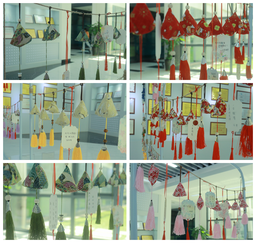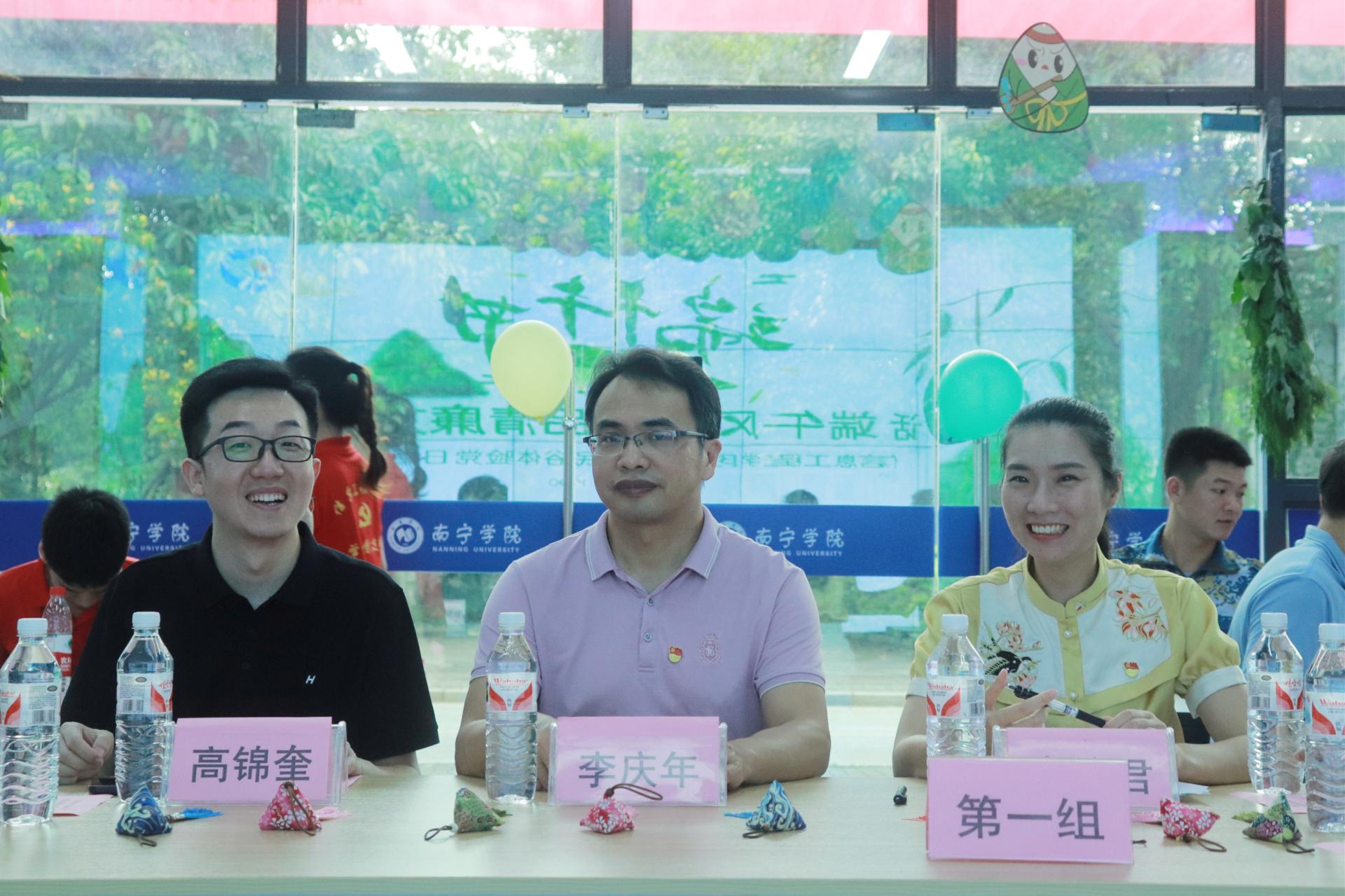 随后,师生齐动手体验端午民俗。老师和同学们一起包粽子、缝香囊、玩游戏、品粽子,现场气氛轻松热烈,师生其乐融融。有的老师包出了人生第一个三角粽,有的男同学拿着针线略显笨拙认真得格外可爱。信息工程学院学生科科长韦丹老师说:“活动现场包粽子、缝香囊、悬艾草的习俗让节日氛围愈加浓烈”。来自2021级的基层班级代表韦德利同学说道:“在大学第一次过端午节,和老师们一起缝香囊很有趣,吃到了美味的粽子,也感受到了南院家一般的温暖”。有的老师表示第一次包粽子,粽子形状有三角的,四角的,就连缠的绳子也是各式各样的,形状各异的粽子显得格外有趣;也有的同学说道,缝香囊是一个认真仔细的针线活,看着一个个五彩缤纷的香囊从自己手中诞生,非常有成就感。