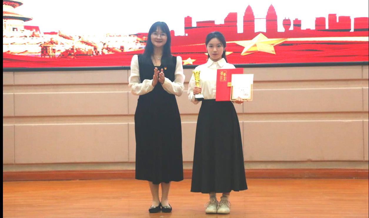 学院党委副书记廖秀媛为获得一等奖及最佳讲解员的选手颁奖