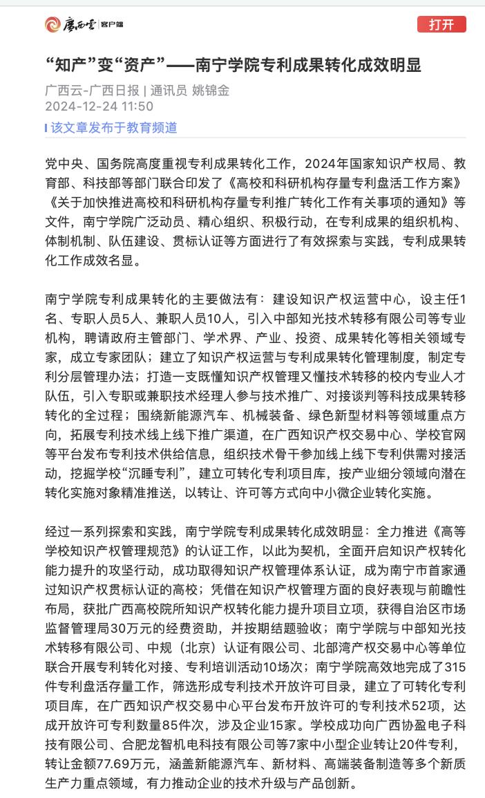 【媒体看南院】广西日报报道“知产”变“资产”——kaiyun体育网页登录入口专利成果转化成效明显