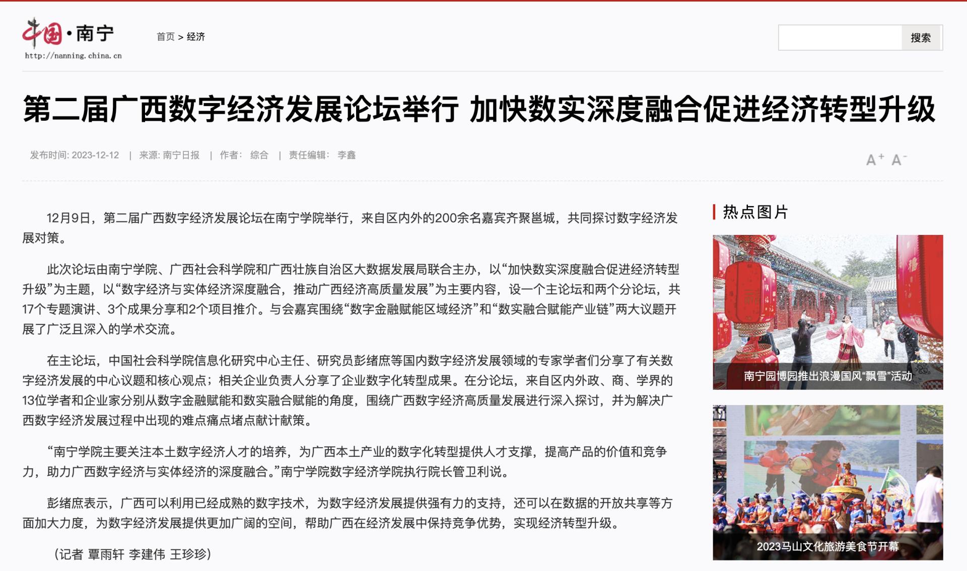 1.中国网:第二届广西数字经济发展论坛举行 加快数实深度融合促进经济转型升级 http://www.nanning.china.com.cn/2023-12/12/content_42631833.htm